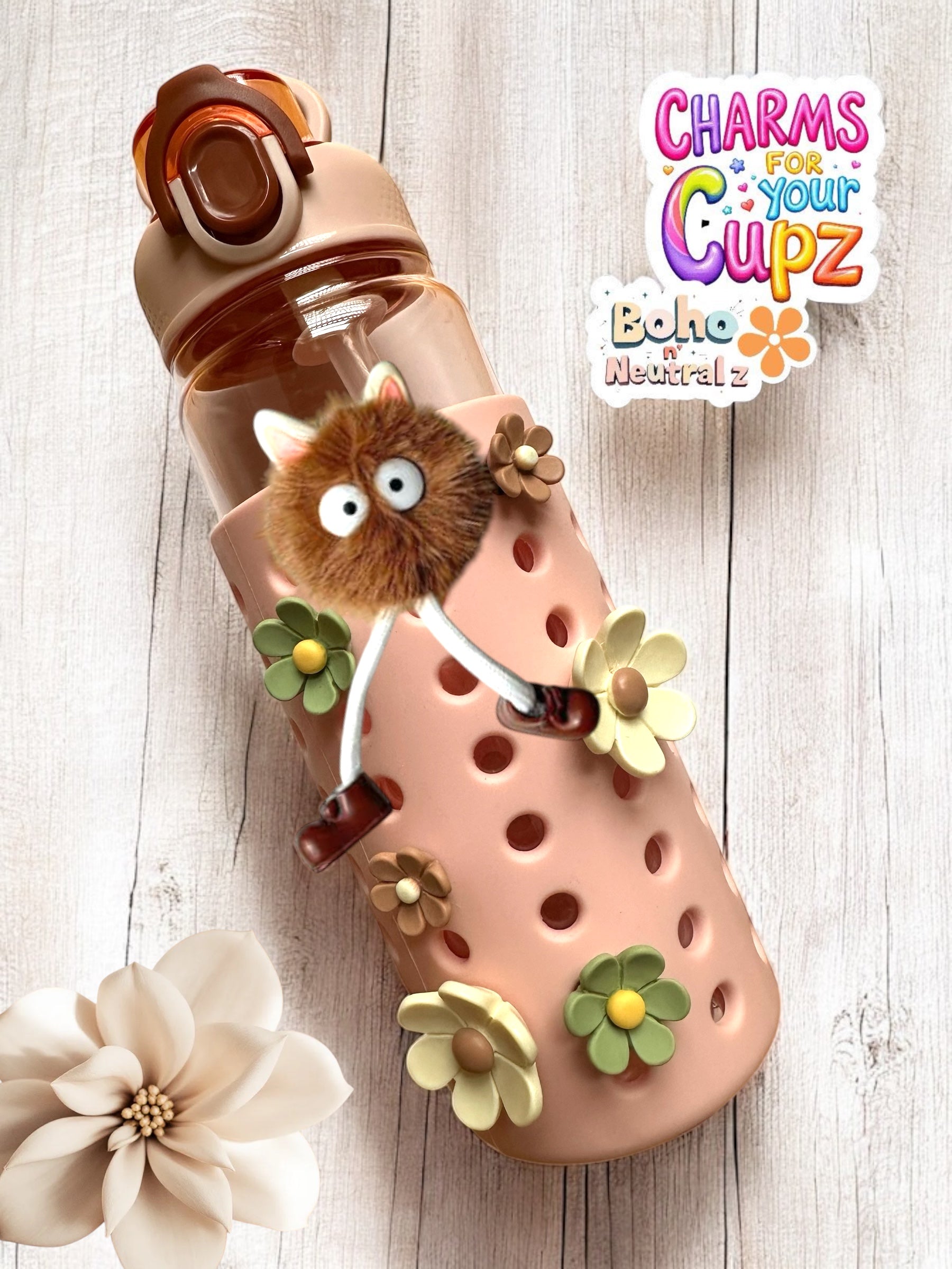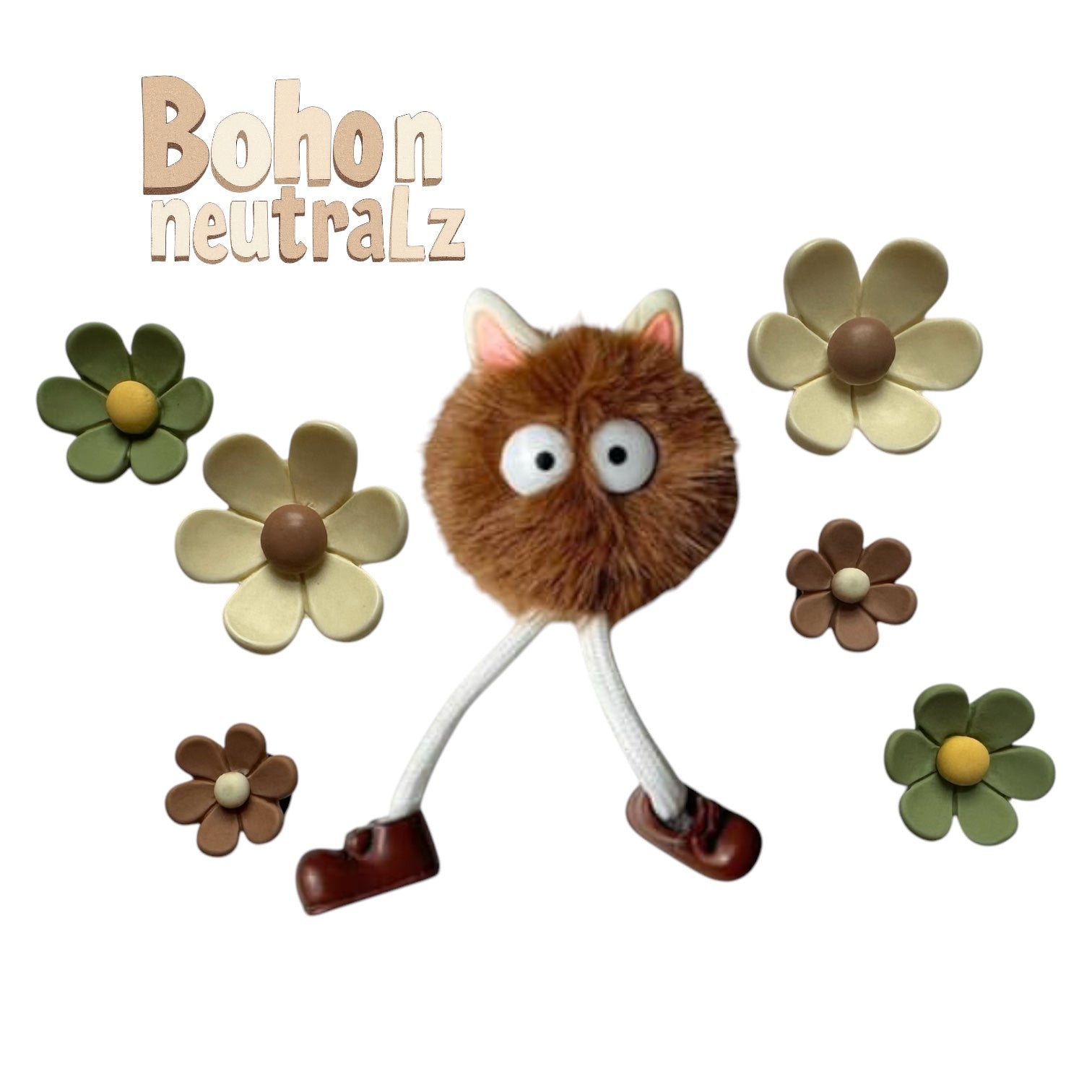 This 7 piece charm bundle set includes 6 neutral color boho themed flowers and a mocha fuzzy petz! Could there BE a better combo?