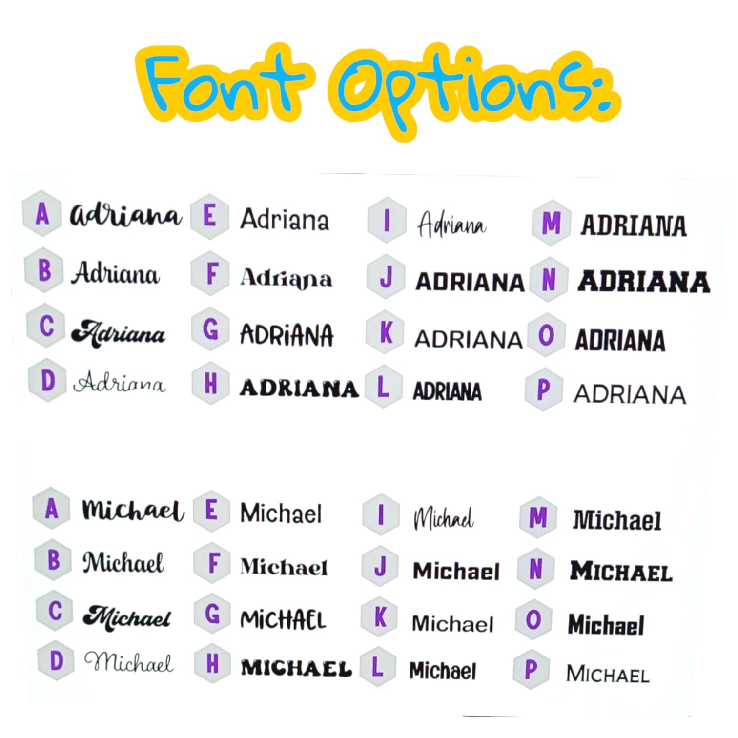 This new addition allows you to expand your personalization!! Pick the font, color of the font and background design from our numerous selections available above!!